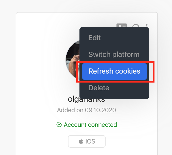 To fix soft feedback required to block( empty post caption issue, challenge on like, follow and unfollow actions and etc.) we need to refresh account session (cookies and device settings). With this modification, we will create a special button to do that with one click.